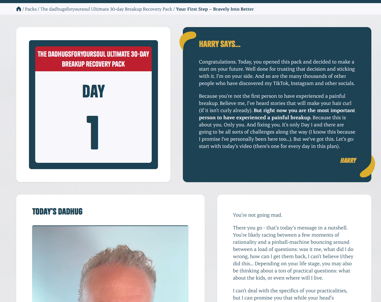 Like all our premium packs, the dadhugsforyoursoul 30 Day Breakup Recovery Pack isn’t a sticking plaster to mask your feelings – it’s a carefully crafted process of comfort and reconciliation, discovery and growth, to take you from emptiness to optimism.